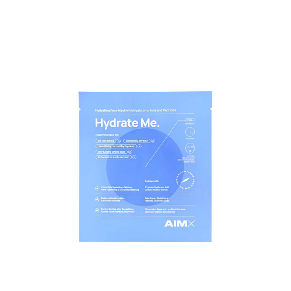 Intensief hydraterend gezichtsmasker voor de vermoeide, uitgedroogde huid. Heeft jouw huid behoefte aan hydratie? De acht verschillende vormen van hyaluronzuur in het sheetmasker Hydrate Me van AIMX brengen de vochtbalans weer op pijl. Hydrate Me is geschikt voor elk huidtype en kun je op elk moment van de dag inzetten om de huid te voorzien van een intense dosis vocht. De 35 verschillende actieve ingrediënten zullen er samen voor zorgen dat langdurig gehydrateerd aanvoelt en er geplumpt uitziet. Baobabzaad is rijk aan vetzuren en helpt bij het herstellen van de huidbarrière, watermeloen, appel en linzenextracten verzorgen samen een prachtig antioxidantencomplex.